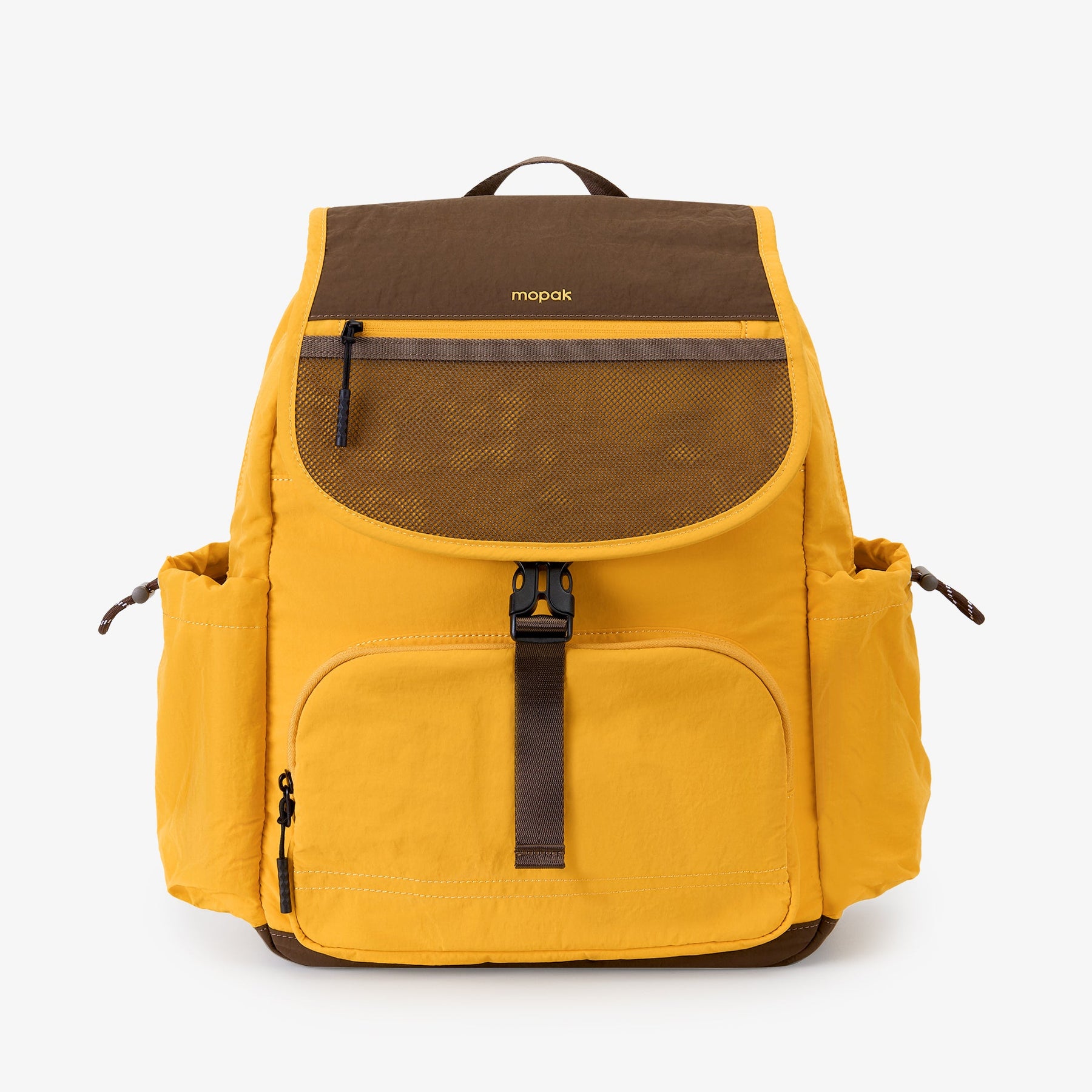 Coast Pack in yellow with brown details, showcasing its two-sided top and ergonomic design for urban exploration.