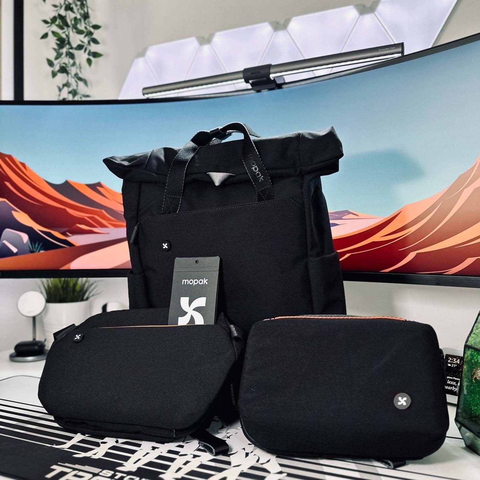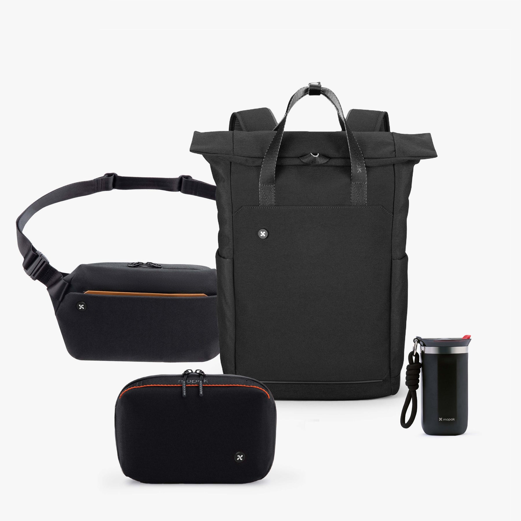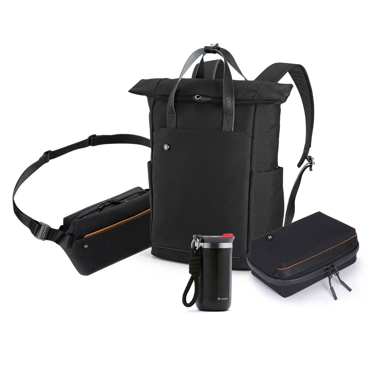 Blending recycled plastic innovation with urban versatility, Day Trip Set’s backpack nests sling and tech pouch, plus water bottle, for streamlined, eco-conscious outings.